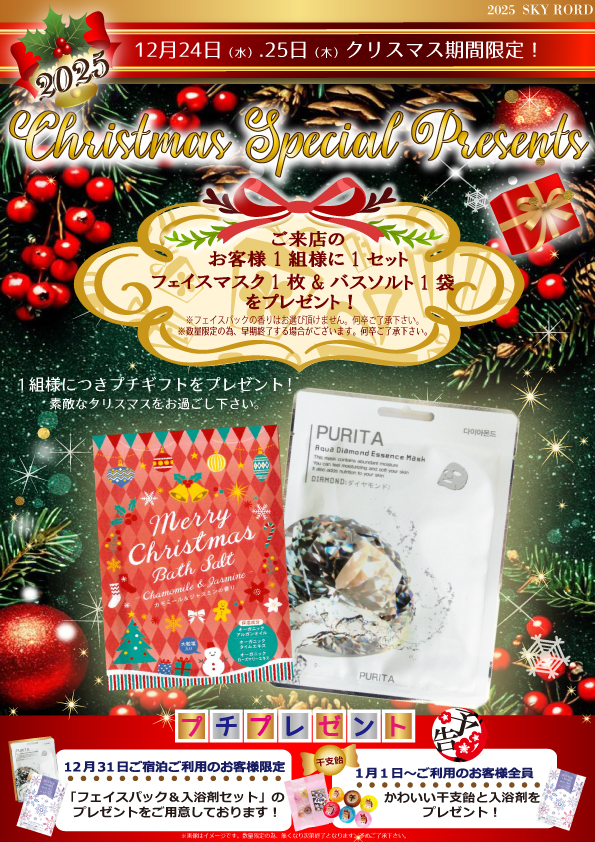 12/23~25日にご宿泊でご利用のお客様へ、プチギフトをご用意してお待ちしております!